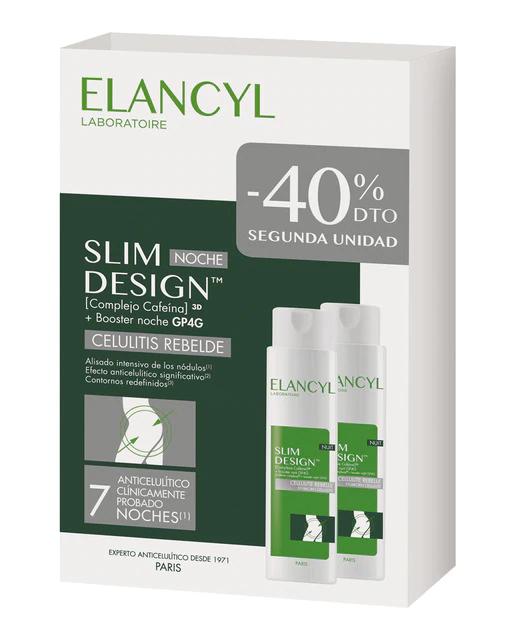 Slim Design Noche contiene activador nocturno GP4G que despierta la actividad celular y favorece su eliminación. Una revolución anti-nódulos con tres acciones: el (Complejo Cafeína)3D es capaz de tratar los tres factores principales de la celulitis para un alisado interno de los nódulos. Textura inteligente enriquecida en aceite de cártamo nutritivo que invita al masaje. Formato: 2 x 200 ml.