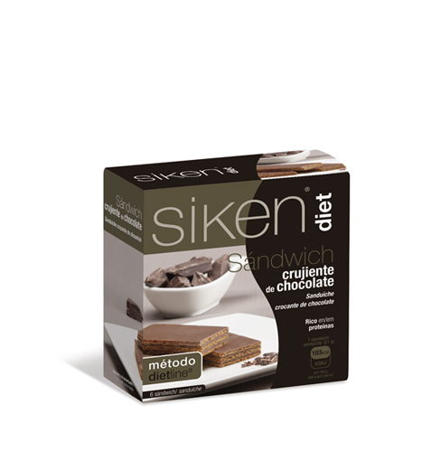 La SIKENDIET Sandwich Chocolate es una galleta tipo wafer con chocolate, rica en proteínas. Este producto ofrece un aporte de tan solo 103 kcal por galleta.